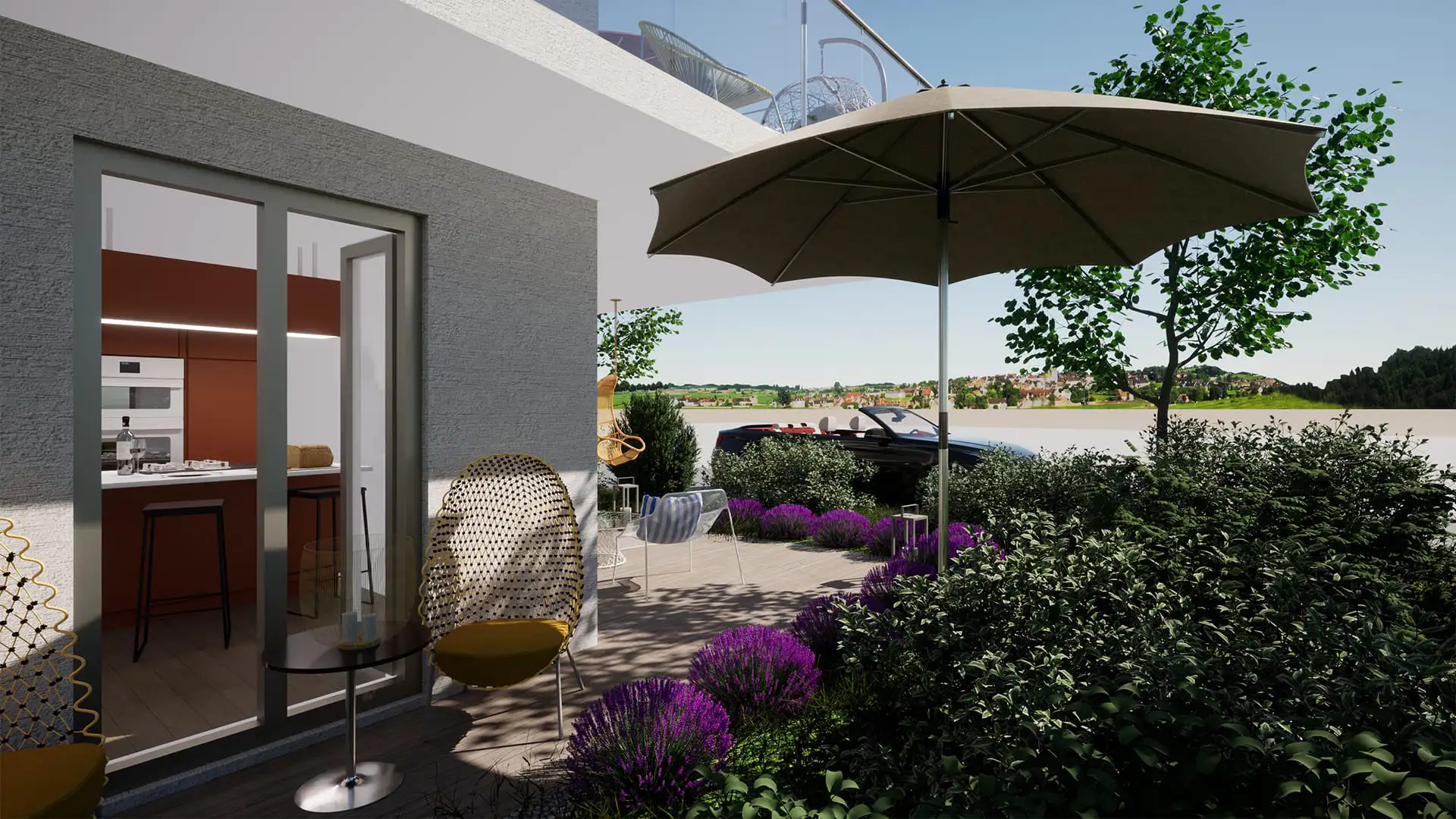 Die Terrassen + Balkone erhalten einen Belag aus WPC-Profilen, Farbe nach Angaben des Architekten.